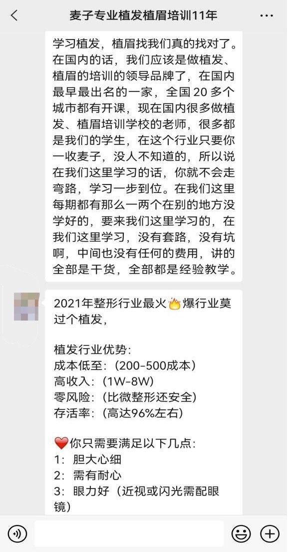 利益誘惑下,還有機構(gòu)招攬人員培訓(xùn),宣稱只需萬元學(xué)費,快一天內(nèi)就可學(xué)會先進(jìn)植發(fā)技術(shù)。“成本可能只需要200-500元,但收入可以達(dá)到1萬元到8萬元。”培訓(xùn)機構(gòu)稱。