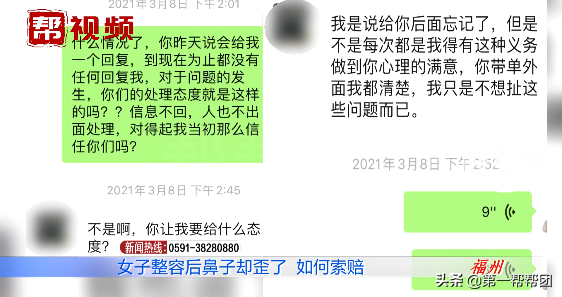在福州工作的熊小姐向我們反映,她在2021年1月份做了整容手術(shù),原本是想讓自己變得更美,結(jié)果卻讓她很傷心,怎么回事?