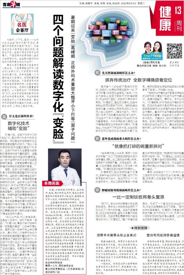 “做工業(yè)產(chǎn)品,可以有廢品率,但是給人做手術(shù),不能有‘廢品’。”孫健介紹,青島大學(xué)口腔學(xué)科是“頜面整形美容”二級學(xué)科博士點(diǎn),口腔一級學(xué)科專業(yè)學(xué)位博士點(diǎn),高水平的人才培養(yǎng)平臺也為口腔頜面部美容整形暨正頜外科的發(fā)展提供了強(qiáng)勁的引擎和動力,為正頜外科團(tuán)隊在這個專業(yè)領(lǐng)域繼續(xù)保持省內(nèi)領(lǐng)先、國內(nèi)先進(jìn)水平奠定了堅實(shí)的基礎(chǔ)。在青島大學(xué)附屬醫(yī)院口腔醫(yī)學(xué)中心,孫健所帶領(lǐng)的正頜外科團(tuán)隊是國內(nèi)早開展“全數(shù)字化正頜外科手術(shù)”的團(tuán)隊之一。近年開展的新技術(shù)新項目“數(shù)字化導(dǎo)航輔助正頜外科手術(shù)”技術(shù),在國內(nèi)專業(yè)雜志發(fā)表了多篇學(xué)術(shù)論文,在國內(nèi)大型學(xué)術(shù)會議上多次進(jìn)行了學(xué)術(shù)報告交流。