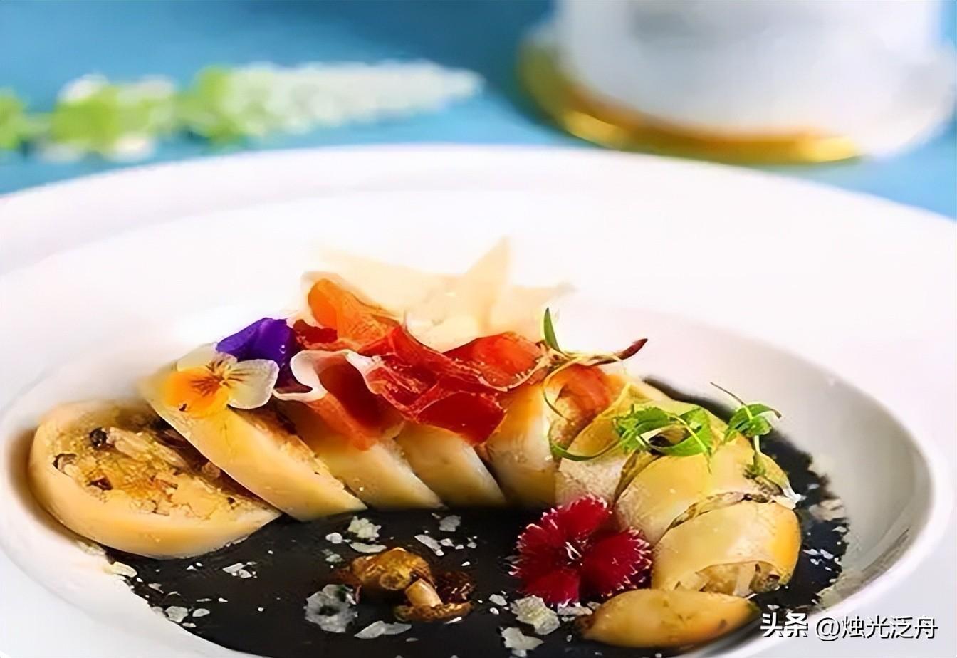 2、炒香白蘑菇粒、香菇粒、魷魚須、尾,加入雞粉、蠔油,和糯米飯拌勻,釀入魷魚桶,用牙簽封口,二面煎香,噴黃酒,加水過魷魚小火煮10分鐘,加鹽、黑胡椒調(diào)底味,撈出切厚片;