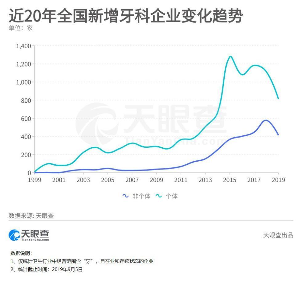 天眼查數(shù)據(jù)顯示,近二十年來,我國共新增12905家牙科企業(yè),且每年新注冊的牙科企業(yè)數(shù)持續(xù)增長。2015-2019年,每年新增牙科企業(yè)均超過1000家,呈井噴式發(fā)展,其中2015年新增的牙科企業(yè)數(shù)接近2014年的兩倍。