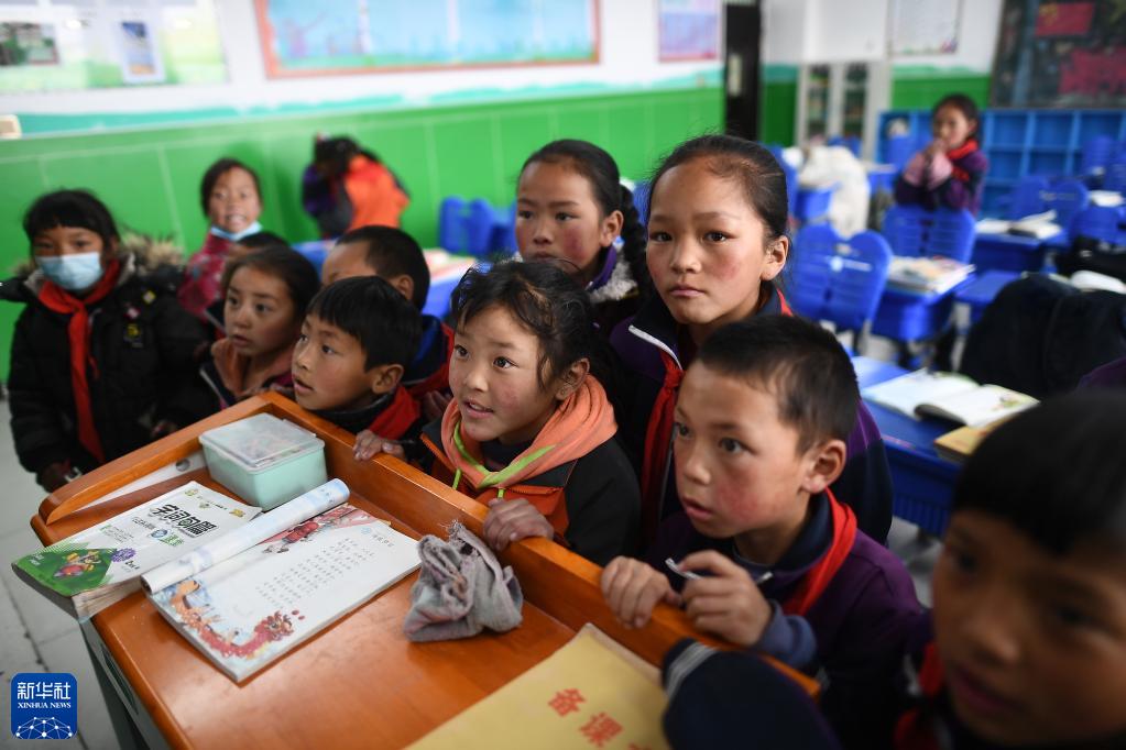 青海省果洛藏族自治州瑪多縣民族寄宿制中學(xué)二年級的學(xué)生在課間觀看多媒體課件(2021年3月26日攝)。該校采用清潔取暖方式后,學(xué)生的學(xué)習(xí)和生活環(huán)境大為改良。新華社記者 張宏祥 攝