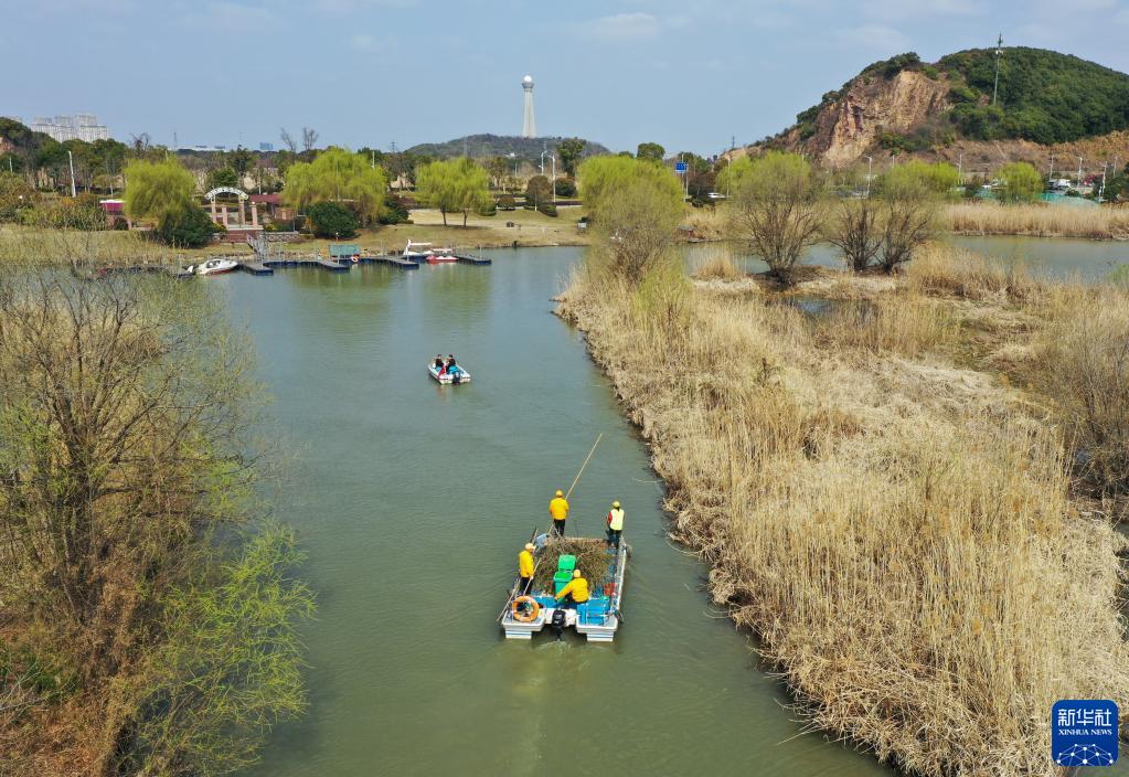 浙江省湖州市吳興區(qū)八里店鎮(zhèn)移沿山村河長帶隊在移沿山村開展巡河、保潔作業(yè)(2021年2月24日攝,無人機(jī)照片)。新華社記者 翁忻旸 攝