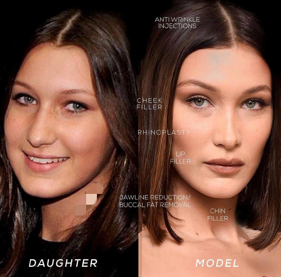 還有肯豆的閨蜜貝拉,五官變化不大,但是就是讓人覺得她動過了。首先是提眉,然后是削鼻,貝拉的鼻頭本來是比較圓的形狀,現(xiàn)在變得更加有硬骨感,精致了不是一星半點(diǎn)。