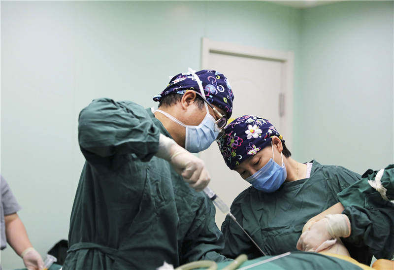在一家整形美容診所內(nèi),主治醫(yī)生與助理正在為求美者進(jìn)行抽脂手術(shù)