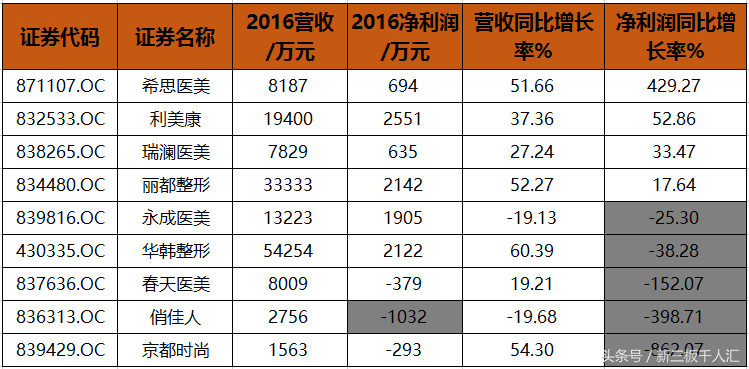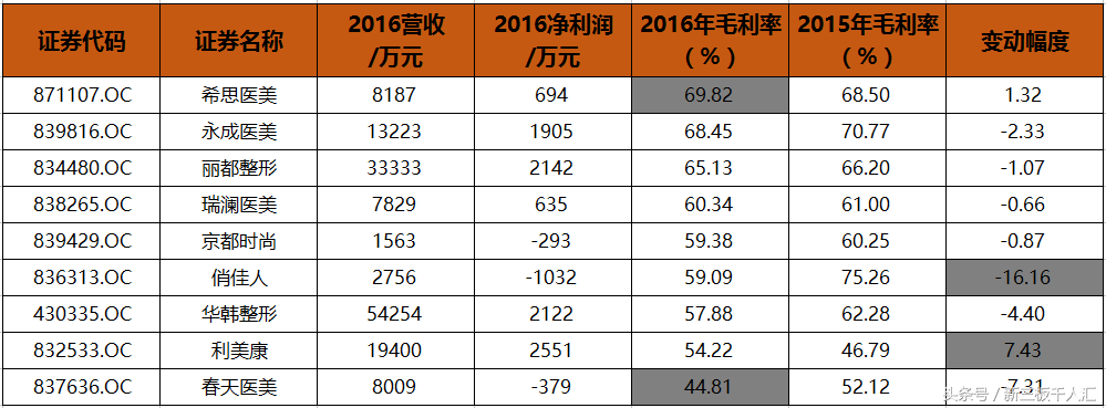 以新三板目前掛牌的9家從事整形美容的機(jī)構(gòu)為例,毛利率在50%以上的有8家,毛利率高的希思醫(yī)美(871107.OC)為69.82%,還有1家毛利率在44%左右。與2015年相比,僅2家毛利率上升,其余7家毛利率均出現(xiàn)不同程度下滑,多的下滑了16個(gè)百分點(diǎn)。
