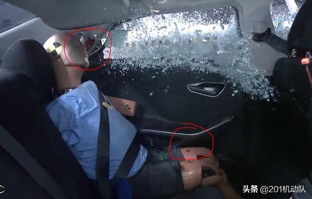 其次,沒有側(cè)氣簾配置。即使車身剛度滿足碰撞要求了,駕駛艙沒有發(fā)生變形。由于沒有側(cè)氣簾對駕駛員頭部的保護,小偏置碰中,假人頭部會向左前方有的偏轉(zhuǎn)。正面氣囊可以在正碰中起到保護左右,但在小偏置碰中,人頭會直接滑過正面氣囊。所以碰撞成績中,正面氣囊保護左右不,側(cè)面氣簾沒有,直接導(dǎo)致得分為P。