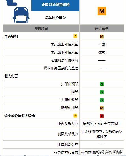 2、耐撞型與維修經(jīng)濟性。下圖是低速碰撞的結(jié)果:P。正碰和追尾兩個0分特別。主要原因就是氣囊爆開了。這個也是中保研,這個代表保險公司利益的測試協(xié)會關(guān)注的的一點。你說在路上隨便追尾了,氣囊如果爆了意味著內(nèi)飾基本上要換一小半。方向盤、儀表板、座椅等等,都是占成本的大頭。保險公司可是不想當這個冤大頭的,所以低速工況下氣囊起爆一律0分。得分為P也就沒有疑問了。