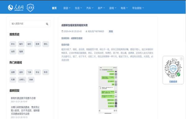 網(wǎng)友在人民網(wǎng)“人民投訴·一鍵維權(quán)”平臺上留言談植發(fā)失敗。