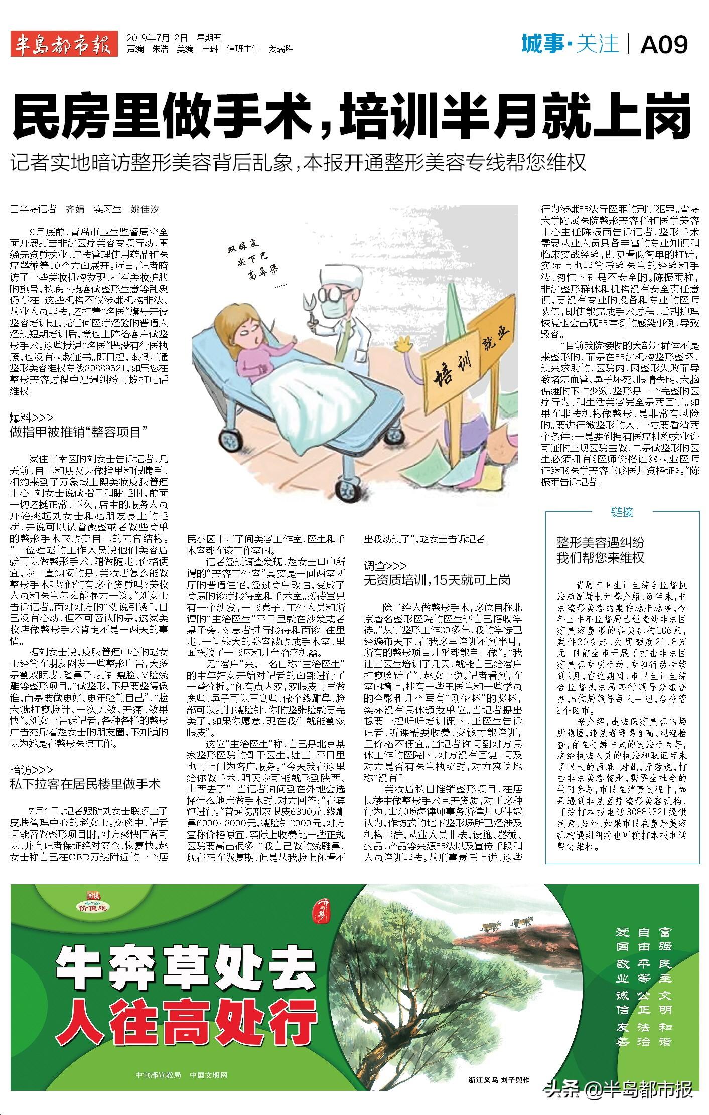 9月底前,青島市衛(wèi)生監(jiān)督局將開展打擊非法醫(yī)療美容專項(xiàng)行動(dòng),圍繞無資質(zhì)執(zhí)業(yè)、違法管理使用藥品和醫(yī)療器械等10個(gè)方面展開。近日,記者暗訪了一些美妝機(jī)構(gòu)發(fā)現(xiàn),打著美妝護(hù)膚的旗號(hào),私底下攬客做整形生意等亂象仍存在。這些機(jī)構(gòu)不僅涉嫌機(jī)構(gòu)非法、從業(yè)人員非法,還打著“名醫(yī)”旗號(hào)開設(shè)整容培訓(xùn)班,無任何醫(yī)療經(jīng)驗(yàn)的普通人經(jīng)過短期培訓(xùn)后,竟也上陣給客戶做整形手術(shù)。這些授課“名醫(yī)”既沒有行醫(yī)執(zhí)照,也沒有執(zhí)教證書。如果您在整形美容過程中遭遇糾紛可留言給我們。