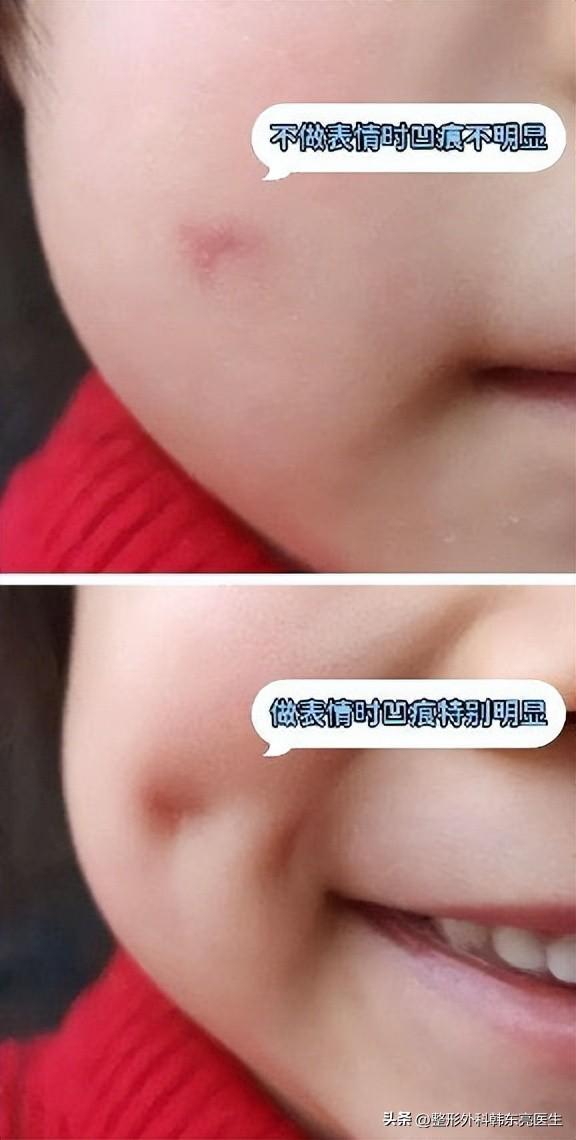 ?第三種是表情凹,這也是很多家長問到的,就是孩子疤痕恢復(fù)好了以后,表面上看是平整的,但是一做表情就會出現(xiàn)的凹陷,用手摸也能摸出來。這個是因為皮下組織黏粘、脂肪缺失導(dǎo)致。如果是需要手術(shù)的傷口,建議盡量選擇精細(xì)美容縫合,逐層對合,避免出現(xiàn)表情凹。