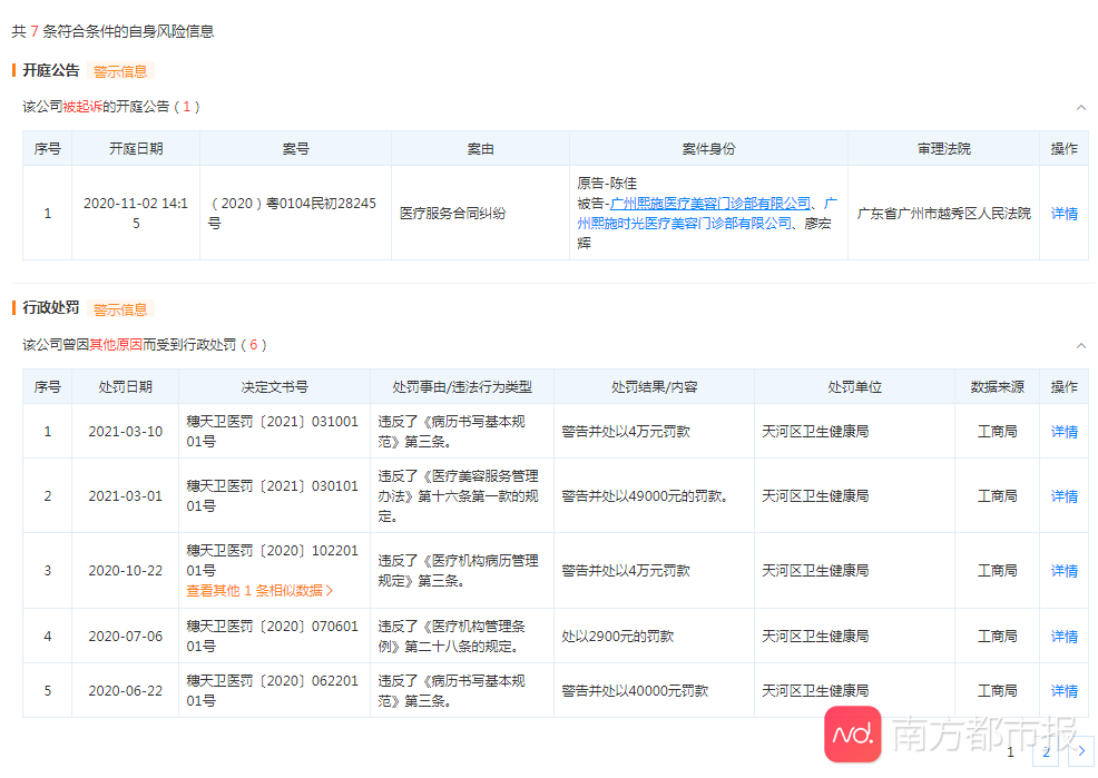 經(jīng)調(diào)查,實施手術(shù)的醫(yī)師未取得獨立實施美容外科手術(shù)的醫(yī)療美容主診醫(yī)師資質(zhì)。天河區(qū)衛(wèi)生健康局依據(jù)《執(zhí)業(yè)醫(yī)師法》給予該醫(yī)師暫停六個月執(zhí)業(yè)活動的行政處罰;該門診部使用未取得相應(yīng)資質(zhì)的醫(yī)師單獨開展隆鼻術(shù),違反《醫(yī)療美容服務(wù)管理辦法》,對該門診部給予警告,并處以49000元罰款的行政處罰。關(guān)于媒體反映該機構(gòu)曾多次違反醫(yī)療機構(gòu)規(guī)定遭到行政處罰的問題,經(jīng)核查,自2019年熙施時光醫(yī)療美容門診部開業(yè)以來,天河區(qū)衛(wèi)生健康局多次對該門診部進行日常監(jiān)督檢查,結(jié)合疫情防控、整治醫(yī)療美容亂象等專項行動,加大監(jiān)管力度?,F(xiàn)場監(jiān)督檢查10余次,重點對醫(yī)療質(zhì)量、病歷書寫規(guī)范、依法執(zhí)業(yè)行為等進行監(jiān)管和檢查,現(xiàn)場指出存在問題,責(zé)令立即整改,共給予6次行政處罰及相應(yīng)不良執(zhí)業(yè)行為記分處理。